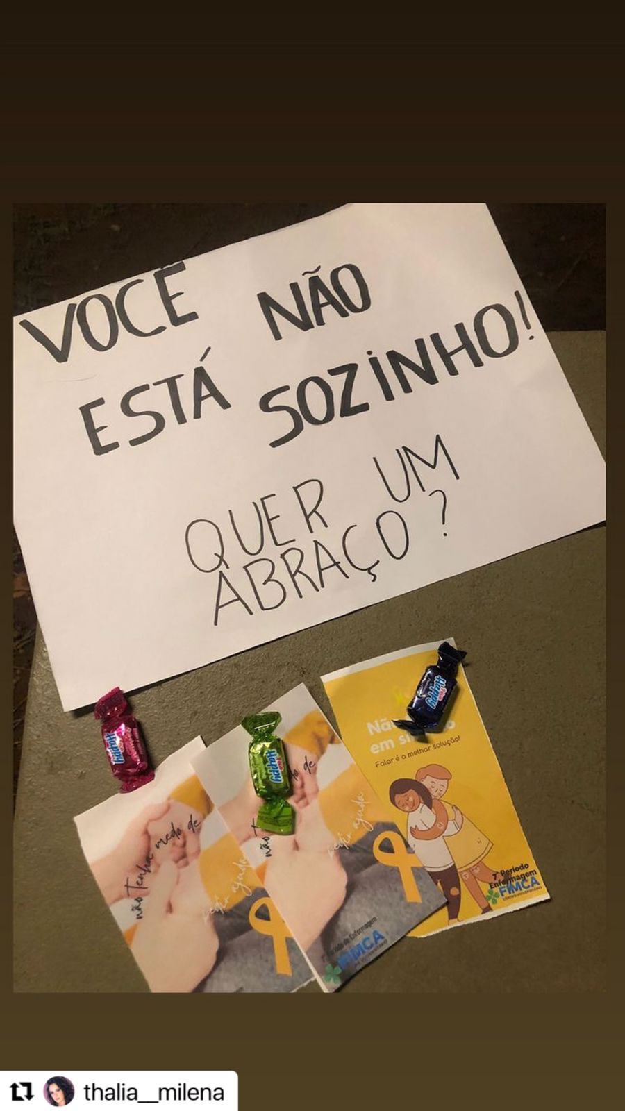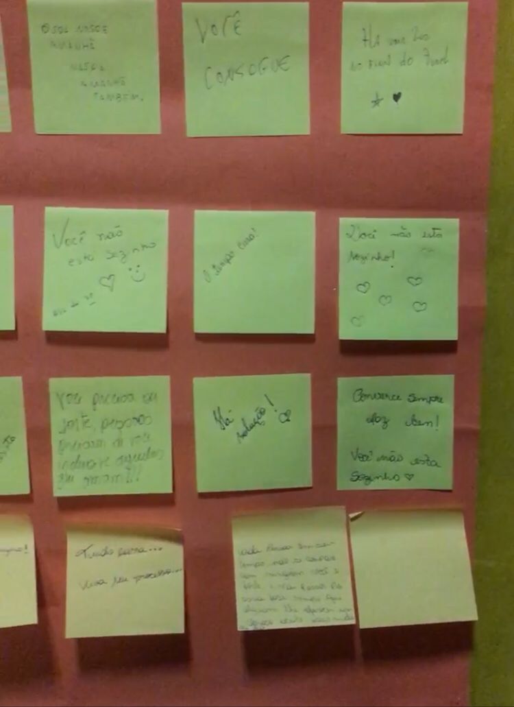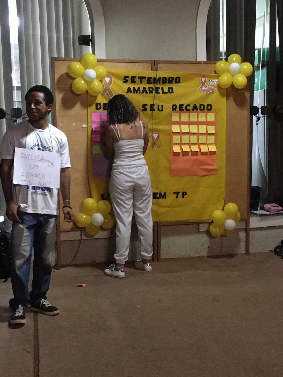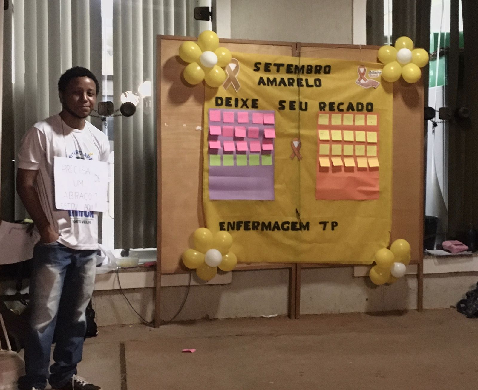 Nesta quarta (28), alunos do 7º período do curso de Enfermagem do Centro Universitário Aparício Carvalho organizaram um mural em alusão ao Setembro Amarelo. Os alunos que passavam podiam deixar mensagens motivacionais. A atividade está relacionada à disciplina se Saúde Mental e foi coordenada pela professora Camila Monique.