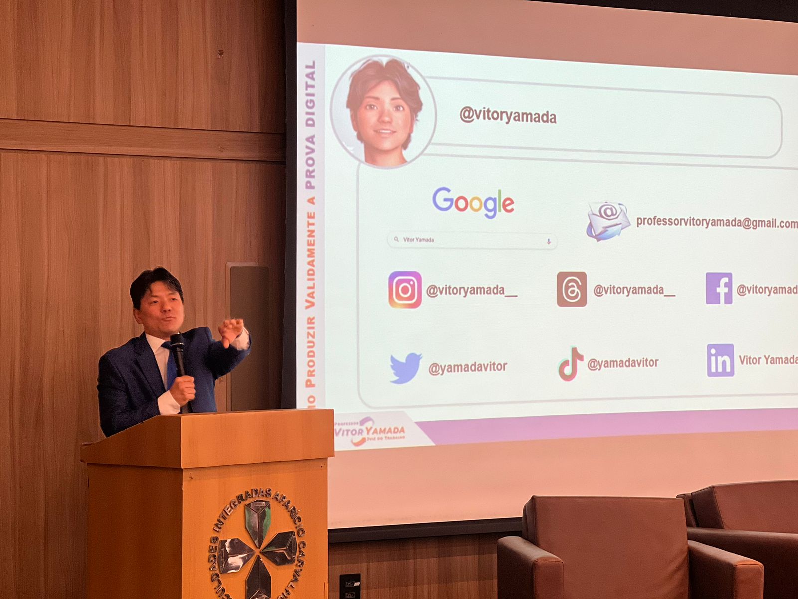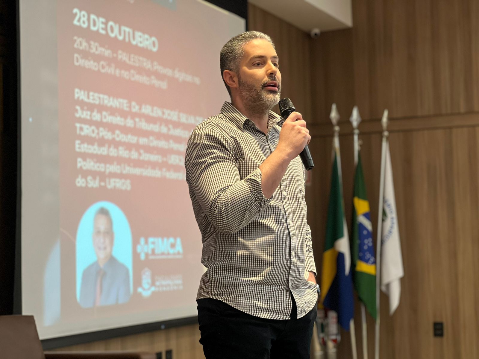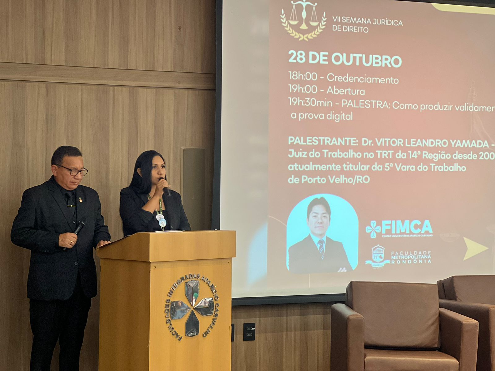 A primeira palestra da noite foi ministrada pelo Dr. Vitor Leandro Yamada, Juiz do Trabalho no TRT da 14ª Região, abordando o tema “Como Produzir Validamente a Prova Digital no Direito”. O magistrado trouxe uma visão prática e atualizada sobre a coleta e validação de provas digitais, tema de extrema relevância no cenário jurídico atual. Em seguida, o Dr. Arlem José Silva de Souza, Juiz de Direito do Tribunal de Justiça de Rondônia (TJRO), explorou o uso das provas digitais no Direito Civil e Penal, abordando questões legais e processuais que envolvem a preservação da integridade e confiabilidade dessas provas.