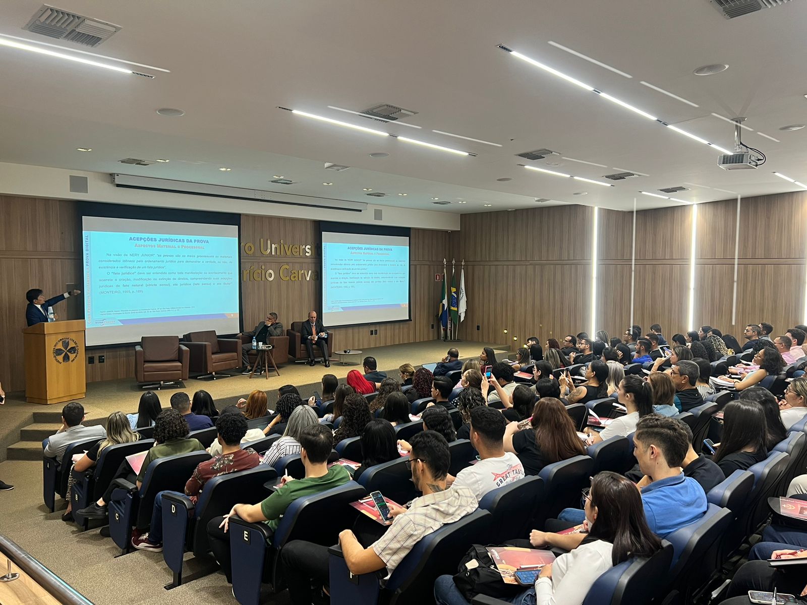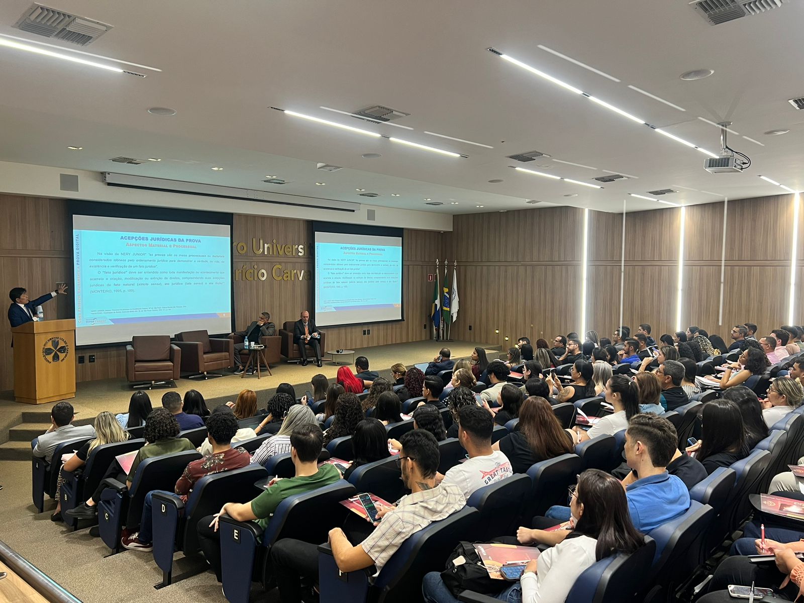 Em seu discurso de abertura, Dr. Aparício Carvalho destacou a relevância da Semana Jurídica como um espaço para a integração de conhecimentos e troca de experiências com profissionais de renome. Ele ressaltou: “É fundamental que nossos alunos tenham contato direto com temas que estão moldando o futuro do Direito. Hoje, mais do que nunca, as provas digitais e a inovação tecnológica permeiam o universo jurídico, e eventos como este preparam nossos estudantes para os desafios e oportunidades da prática profissional.”
