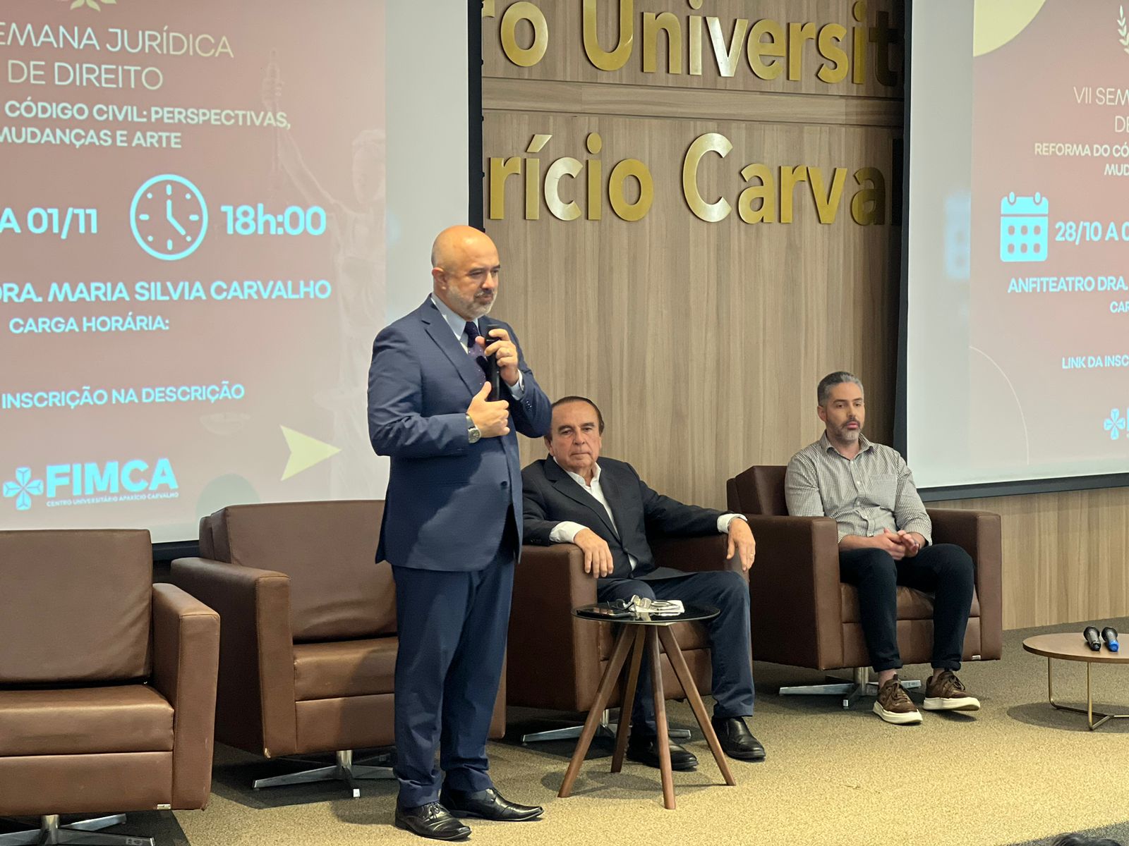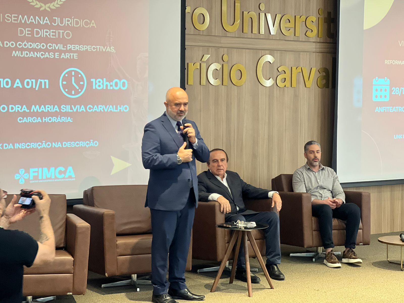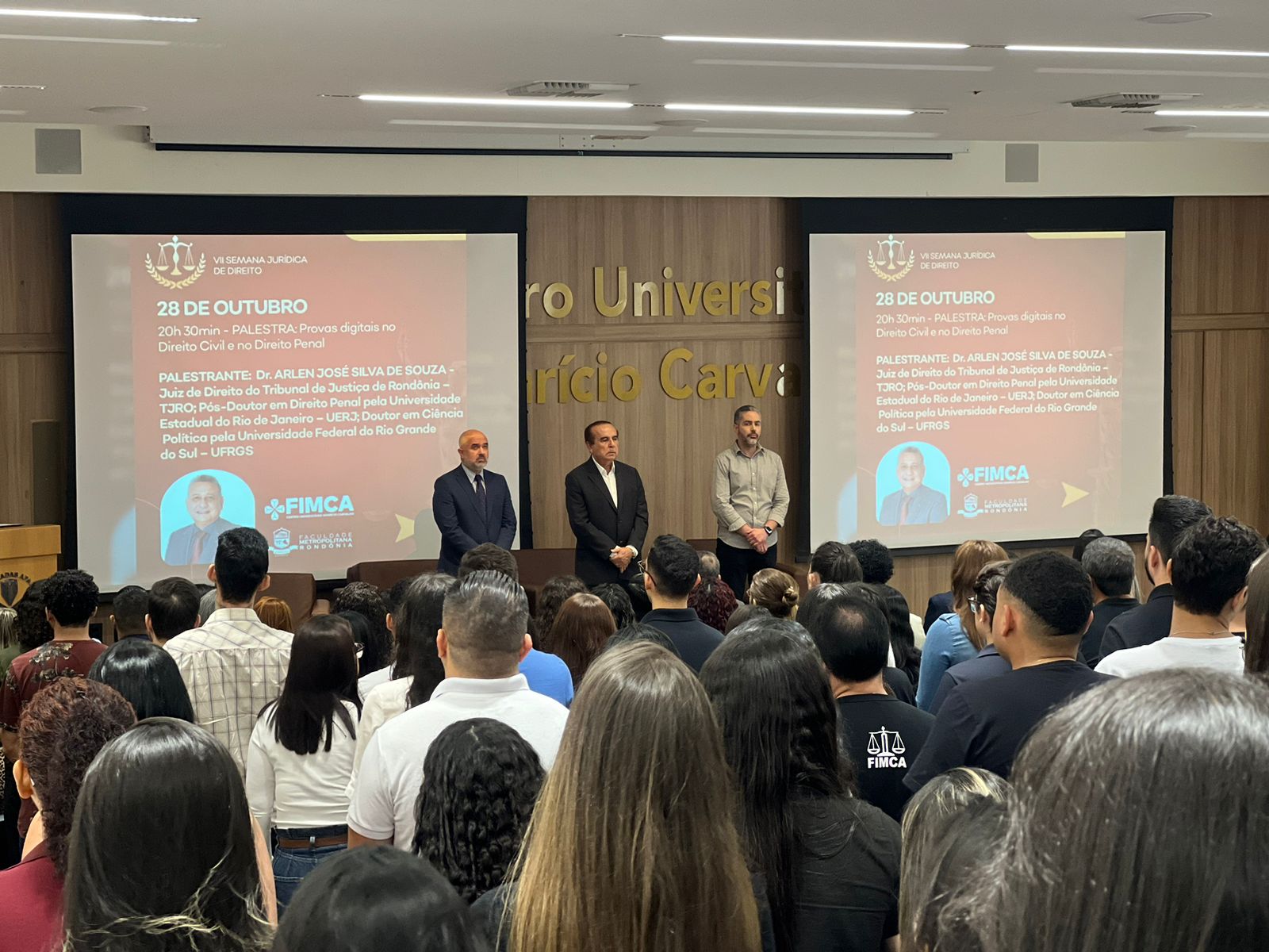 Na última segunda-feira, o anfiteatro Dra. Maria Silvia Carvalho foi palco do início da 7ª Semana Jurídica do curso de Direito da FIMCA, trazendo debates fundamentais sobre as práticas do direito contemporâneo. A mesa de honra do evento contou com a presença do Reitor Emérito da FIMCA, Dr. Aparício Carvalho, do Coordenador Pedagógico Fernando Ramalho e do Coordenador do curso de Direito, Dr. Cesar Jacques.