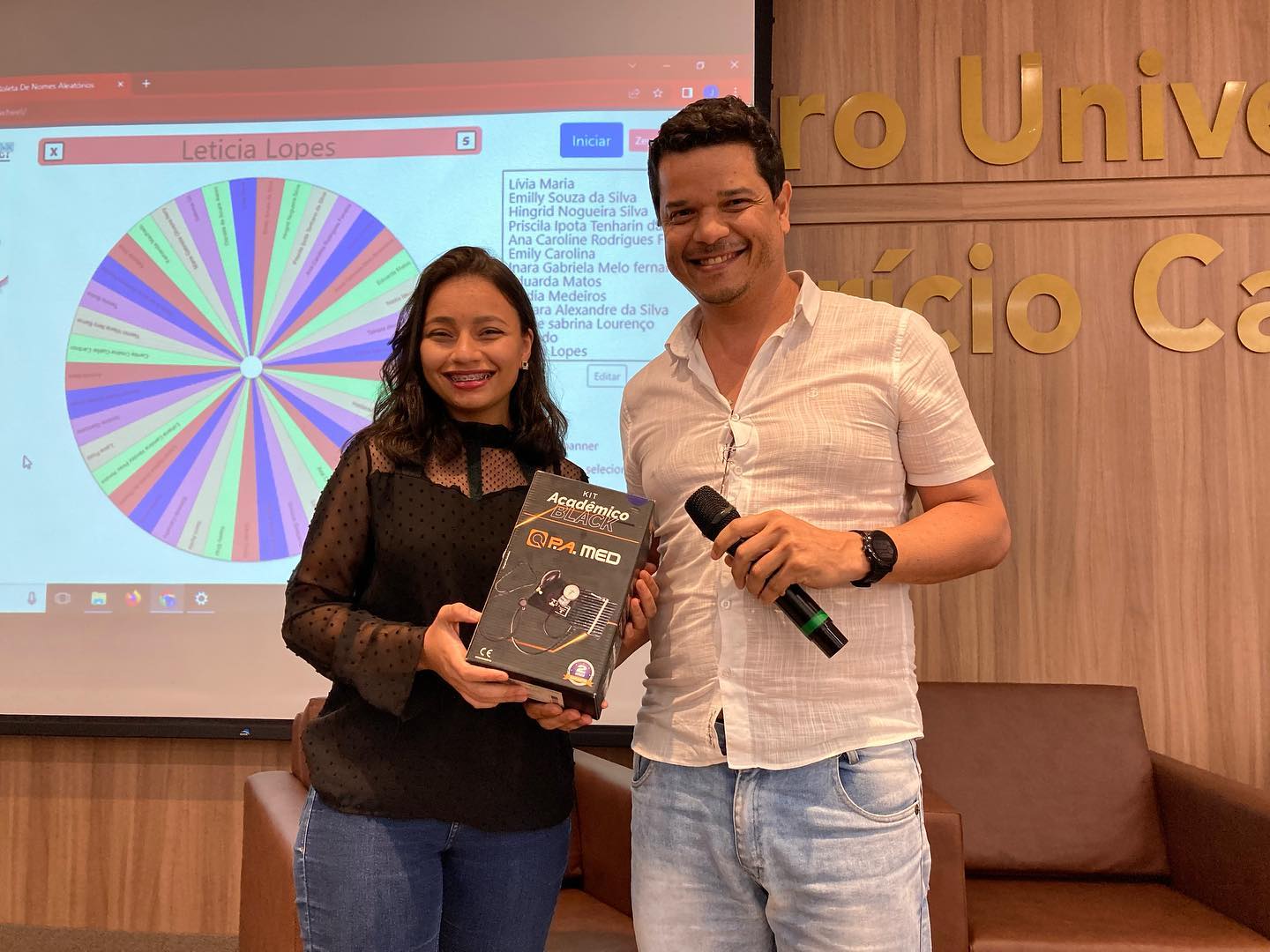 Ao final foram realizados sorteio de brindes, recebemos o convidado Erik Araújo representante da Dental Rondônia sorteando um kit acadêmico, a ganhadora foi a acadêmica Letícia Lopes, do curso de Enfermagem.