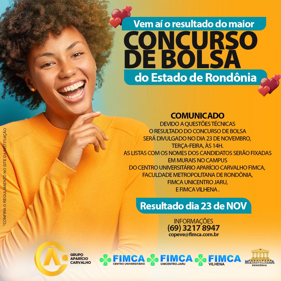 Devido a questões técnicas, o resultado do concurso de bolsa, será divulgado no dia 23 de novembro, terça-feira às 14h, fixado em murais nos campus do Centro Universitário Aparício Carvalho – FIMCA, Faculdade Metropolitana de Rondônia, FIMCA Unicentro Jaru e FIMCA Vilhena. Os candidatos devem se dirigir até o local onde foi realizado a sua prova.