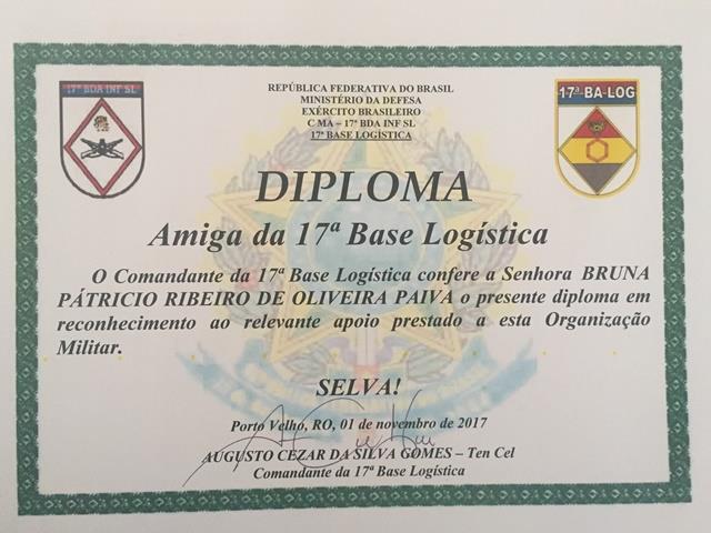Nesta ultima quarta – feira, dia 01/11/17, a coordenadora do curso de Nutrição Bruna Paiva foi convidada pelo Comandante da 17ª Base Logística do Exército o Tenente Coronel Augusto Cezar da Silva Gomes para ser agraciada com o Título de "AMIGA DA 17ª Base Logística do Exército" durante a solenidade de comemoração do dia do Material Bélico e do 24ª Aniversário desta Organização Militar.