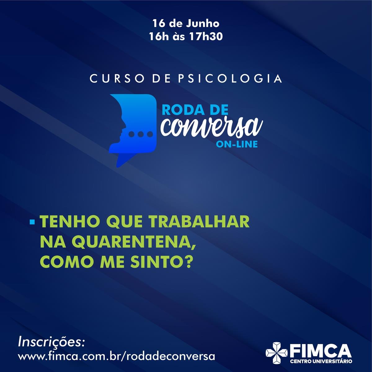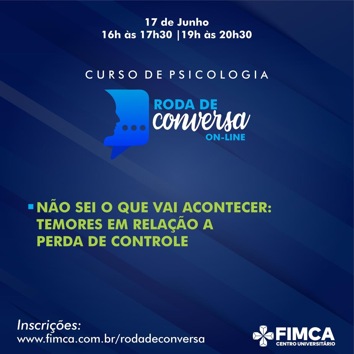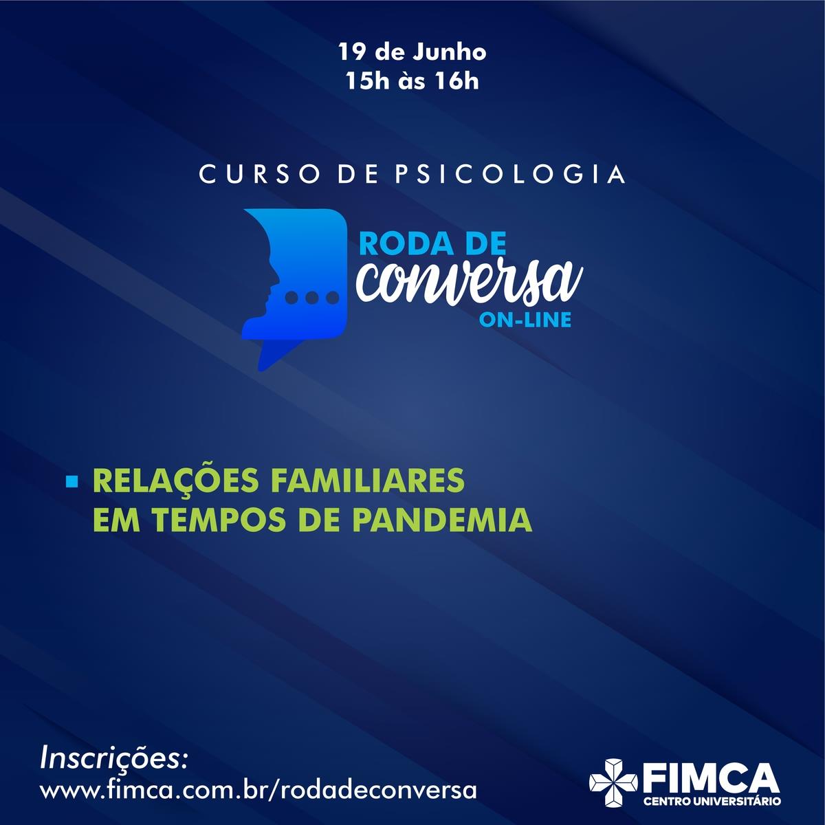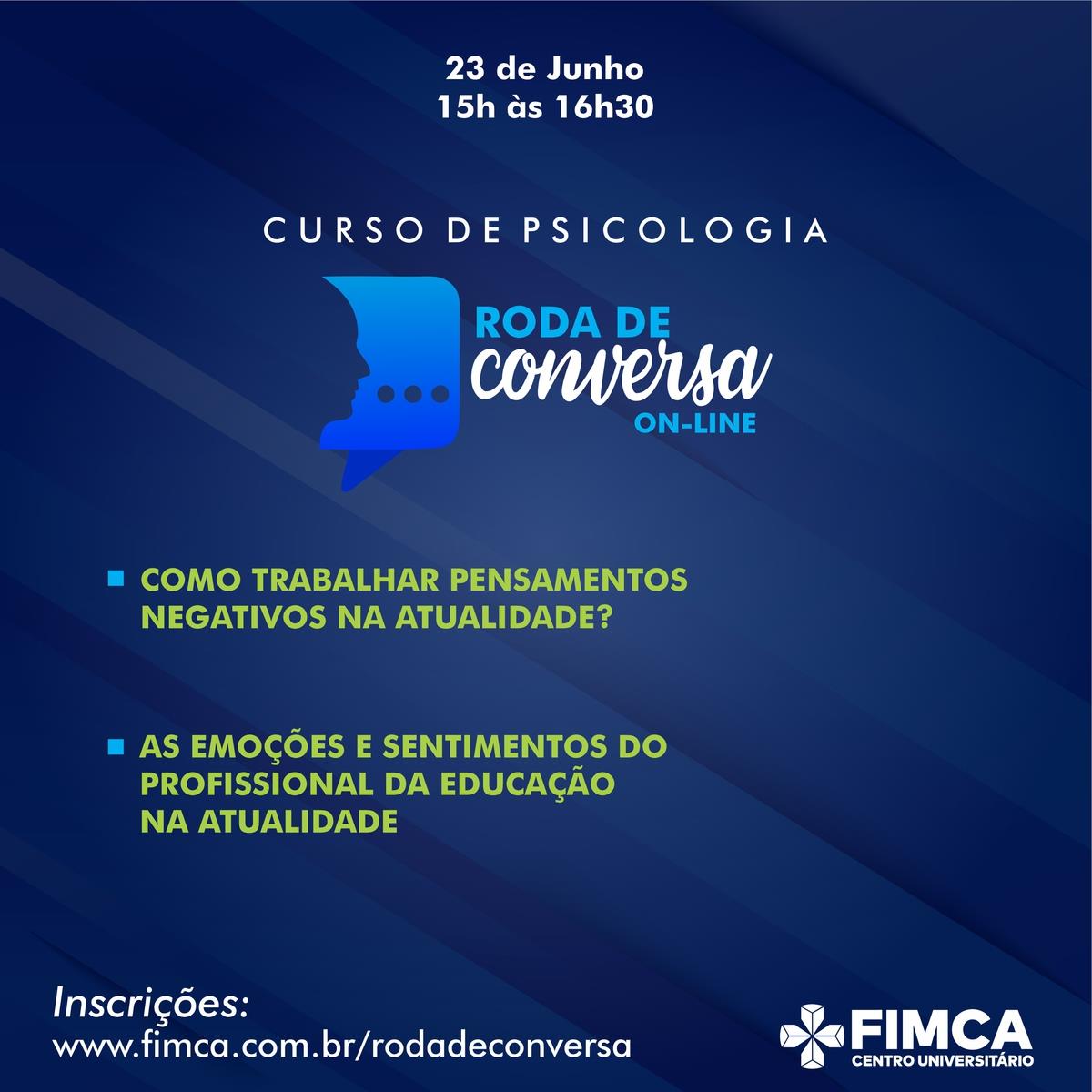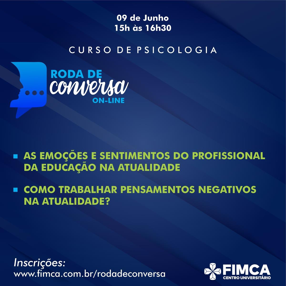 Começa hoje, terça-feira (09) uma roda de conversa online promovida pelo Curso de Psicologia do Centro Universitário Aparício Carvalho – FIMCA. O evento contará com vários palestrantes que abordarão temas importantes para a área da Psicologia. As inscrições são feitas através do site www.fimca.com.br/rodadeconversa . Veja abaixo a programação: