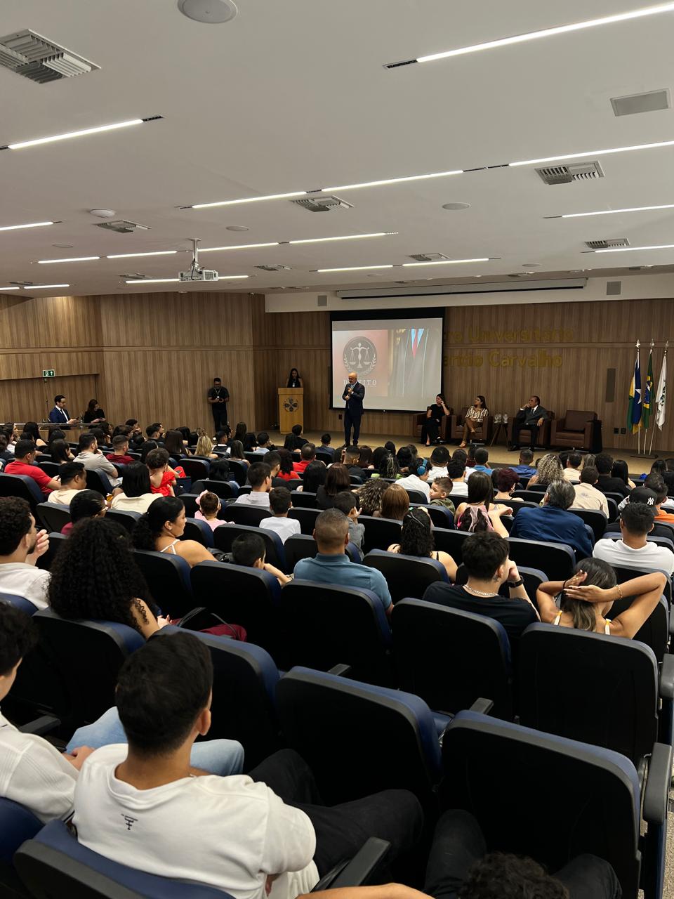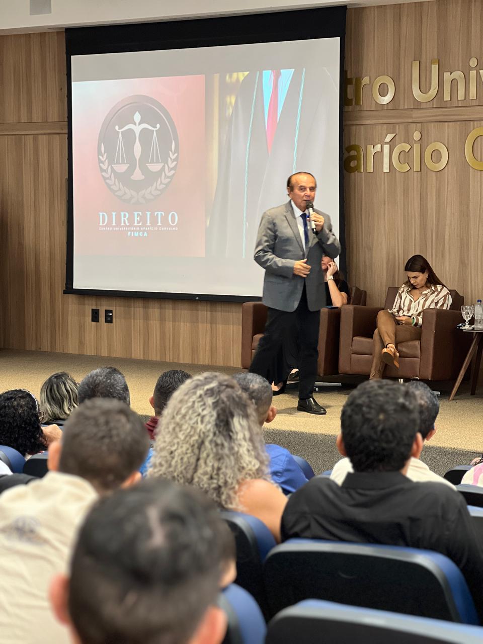 Durante sua fala, o Reitor Emérito Dr. Aparício Carvalho destacou a importância do compromisso com a justiça e a ética desde os primeiros passos da formação acadêmica: