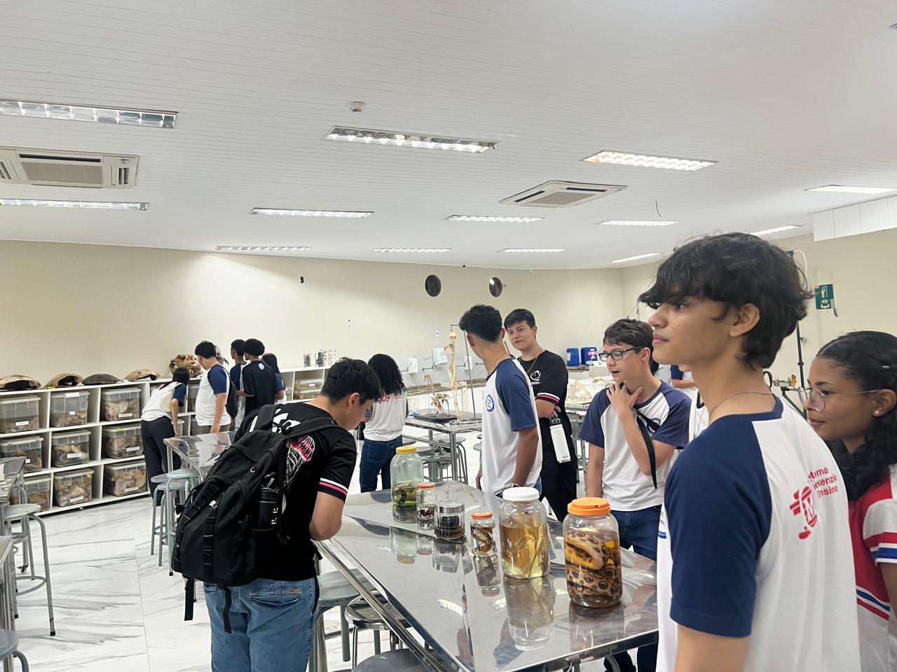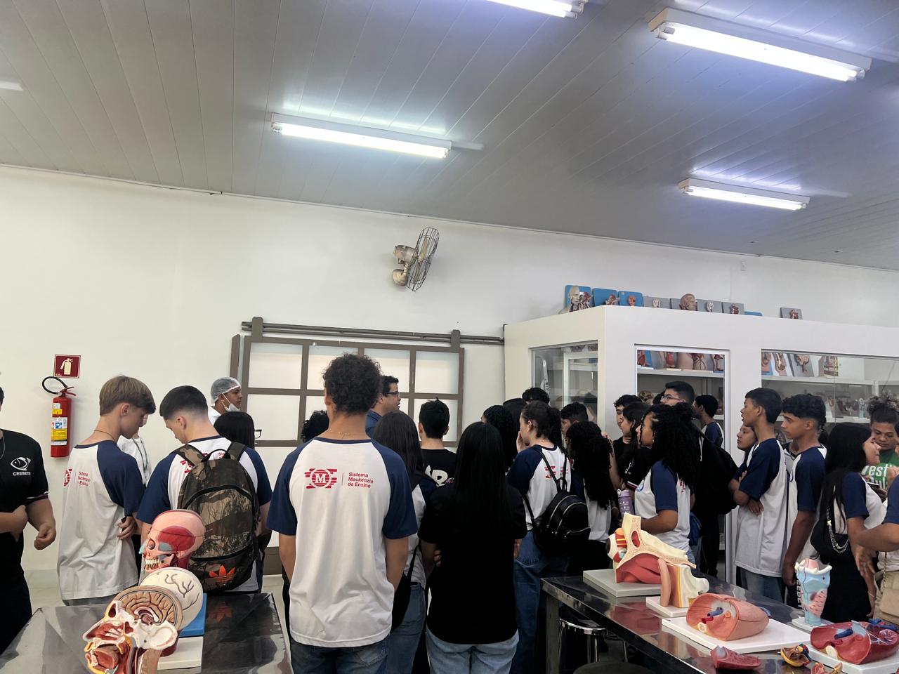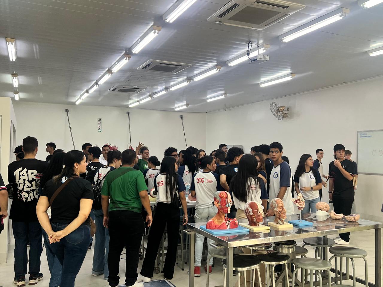 A experiência continuou com uma passagem pelos laboratórios de anatomia humana e veterinária, proporcionando uma visão profunda sobre o funcionamento do corpo humano e dos animais. Em seguida, os alunos conheceram o Hospital de Simulação e Habilidade de Alta Fidelidade, onde estudantes das áreas médicas treinam em cenários de simulação que reproduzem fielmente situações clínicas, aprimorando sua capacidade de resposta e tomada de decisão.