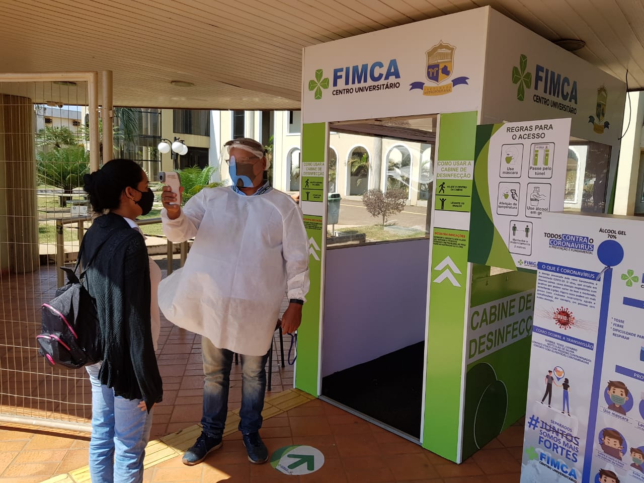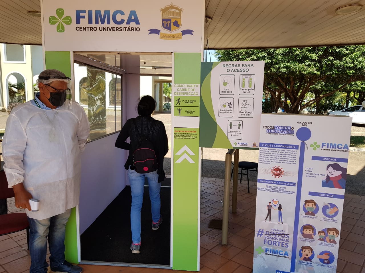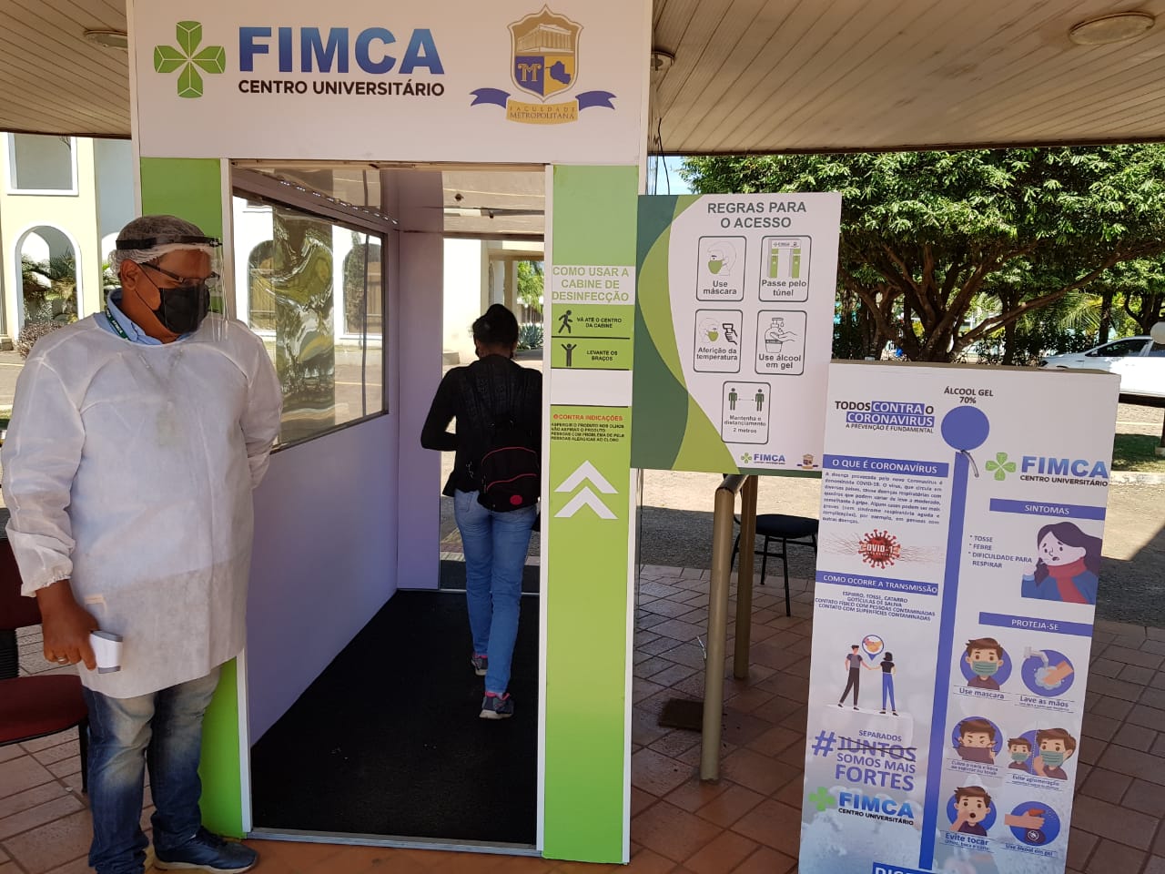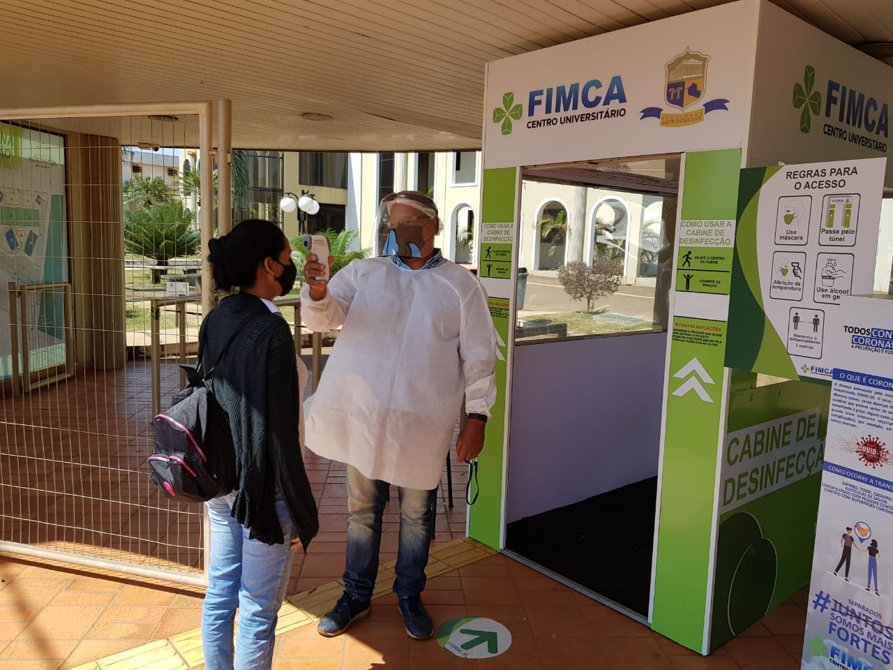 Mesmo como os números de infectados pelo novo coronavírus diminuindo na capital, os cuidados precisam continuar sendo tomados, hoje todas as pessoas que chegam no Centro Universitário Aparício Carvalho – FIMCA tem sua temperatura medida logo na chegada, o uso do álcool em gel é feito nas mãos e o uso de mascará é obrigatório, todos também passam por uma cabine de desinfecção.