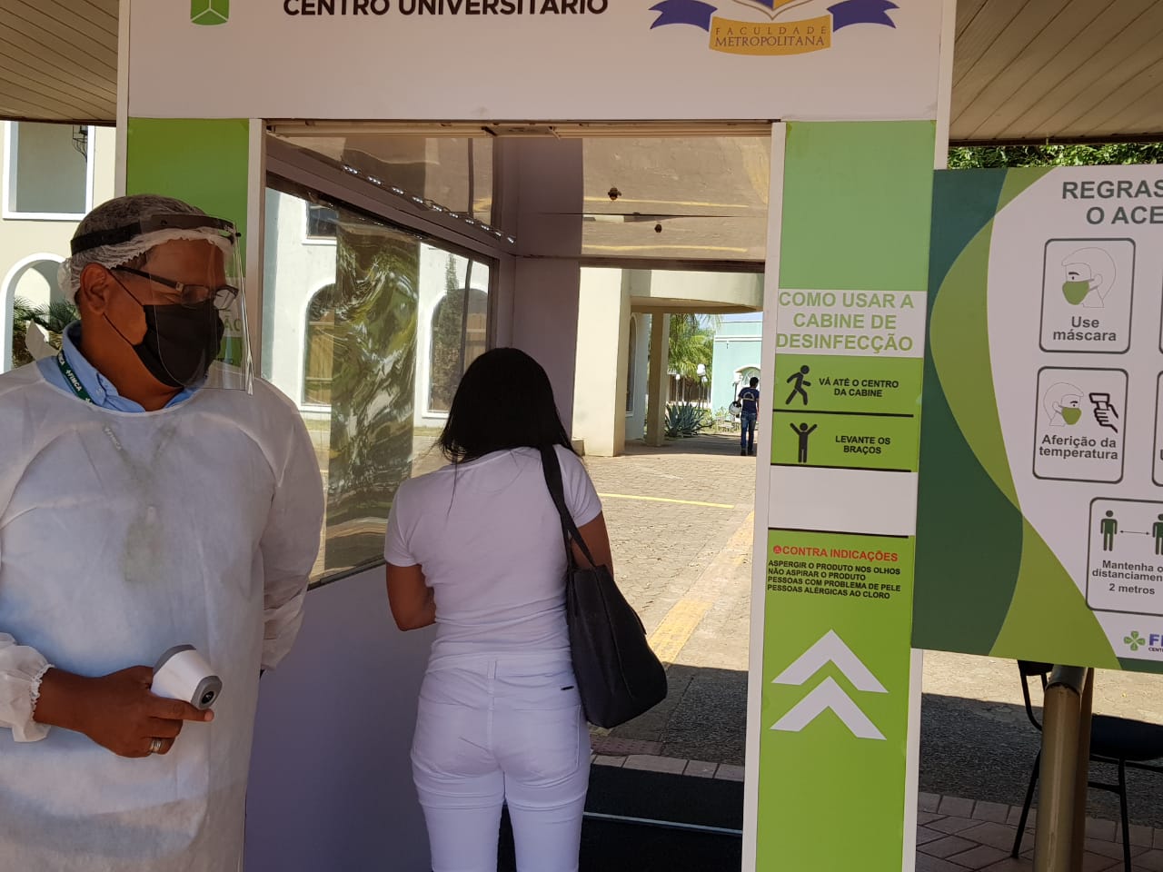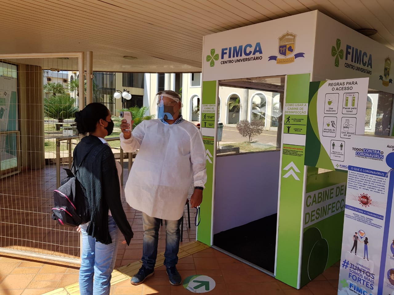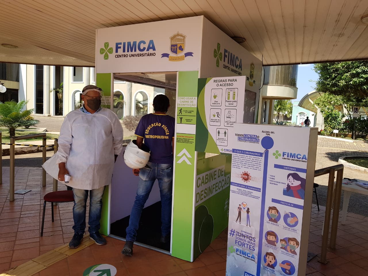 Mesmo como os números de infectados pelo novo coronavírus diminuindo na capital, os cuidados precisam continuar sendo tomados, hoje todas as pessoas que chegam no Centro Universitário Aparício Carvalho – FIMCA tem sua temperatura medida logo na chegada, o uso do álcool em gel é feito nas mãos e o uso de mascará é obrigatório, todos também passam por uma cabine de desinfecção.