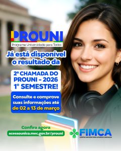 Foi publicada nesta segunda feira, 02 de MARÇO, a SEGUNDA chamada do Programa Universidade para Todos (PROUNI) 2026/1. Os candidatos pré-selecionados deverão comparecer à secretaria da instituição do Centro Universitário Aparício Carvalho – FIMCA, à qual se candidataram, no período de 02 a 13 de MARÇO de 2026, para realizar a comprovação das informações prestadas no ato da inscrição.