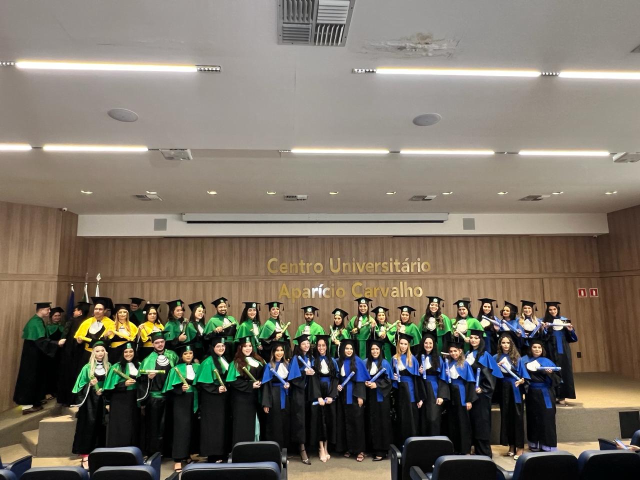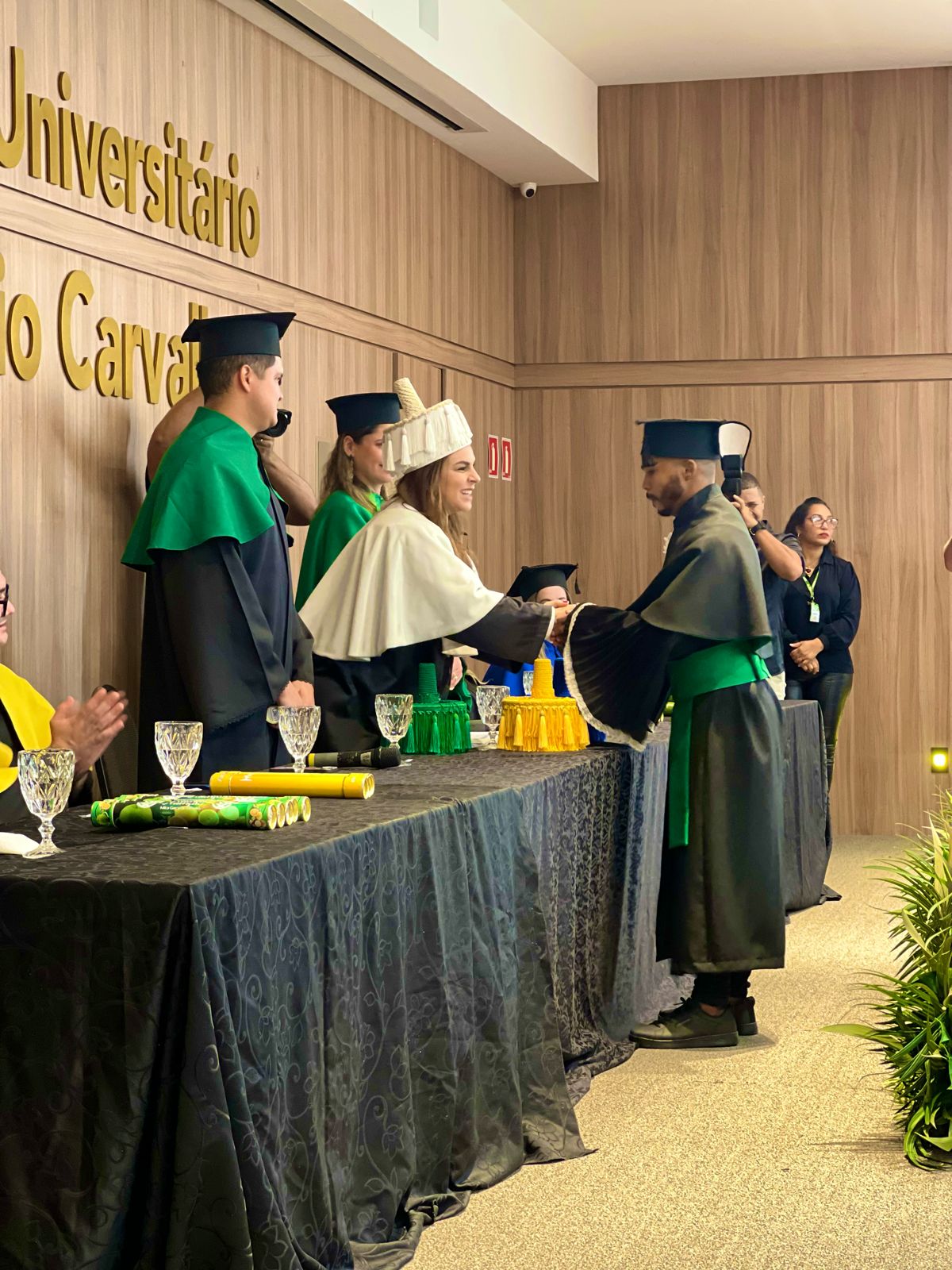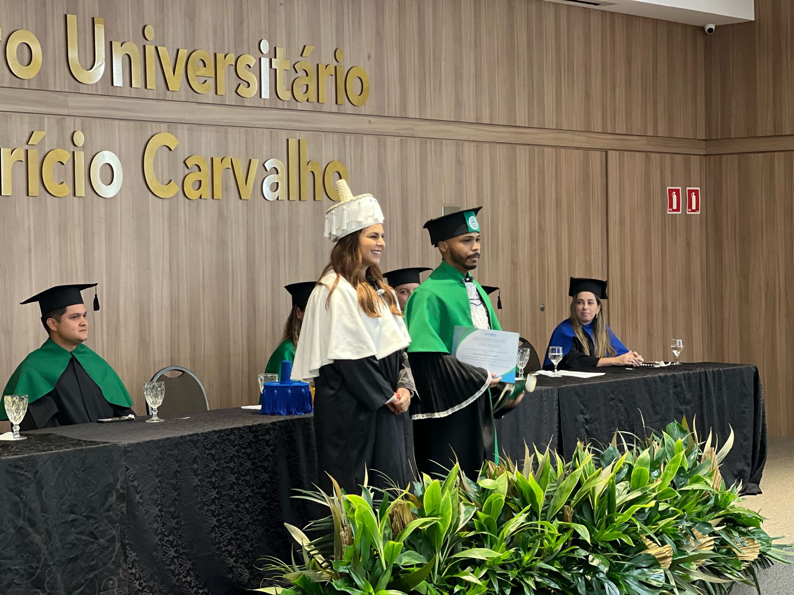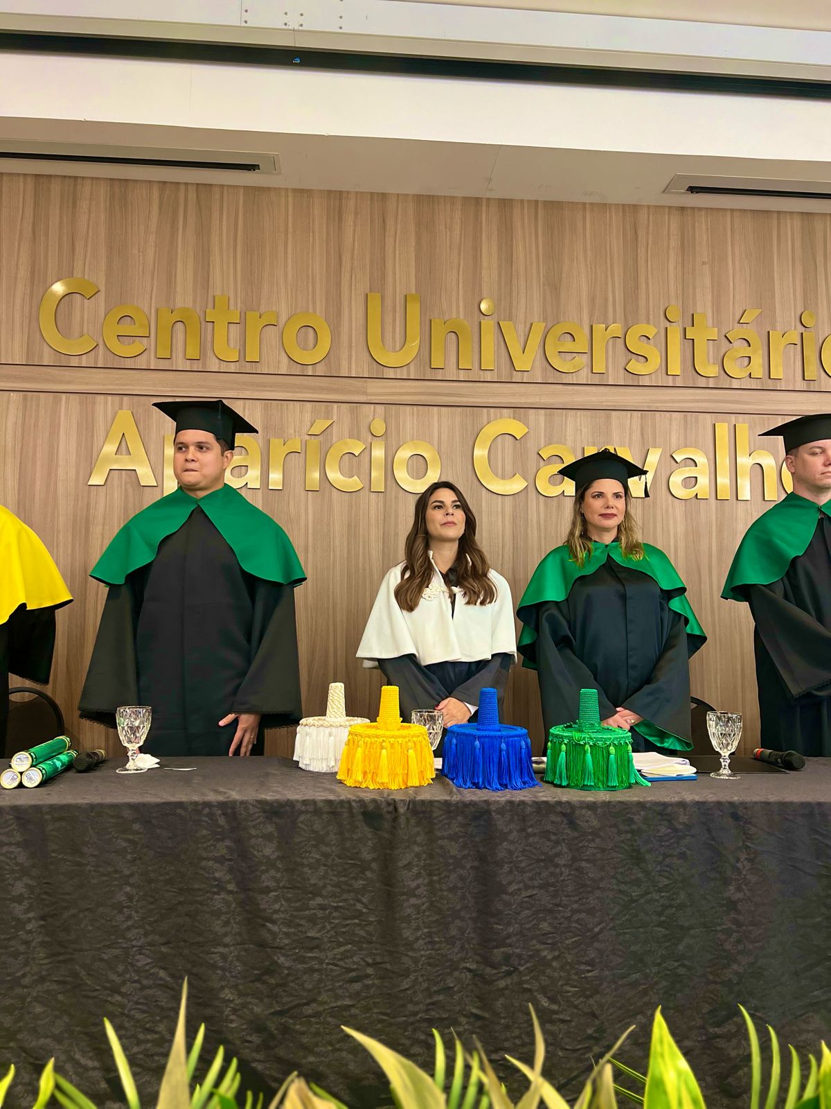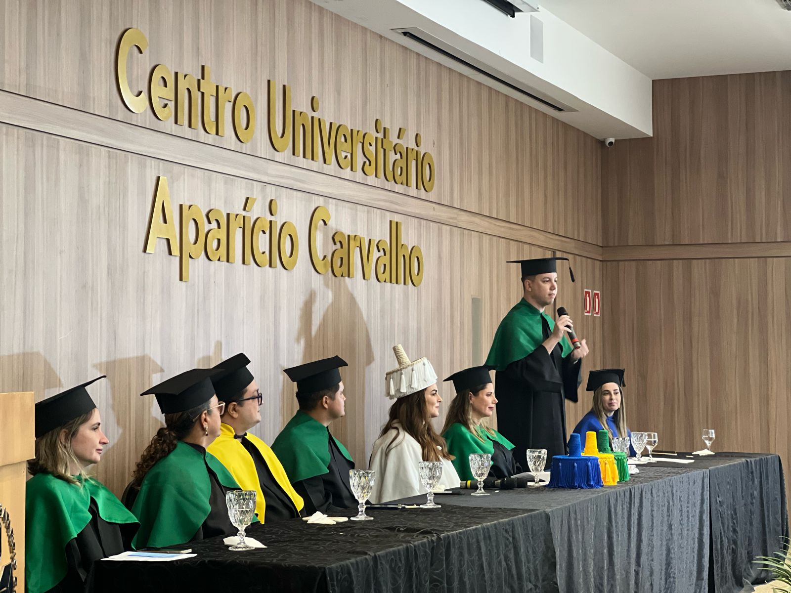 A solenidade foi iniciada com a leitura de uma carta marcante enviada pelo Reitor Emérito e Diretor-Presidente do Grupo Educacional Aparício Carvalho, Dr. Aparício Carvalho de Moraes, que parabenizou cada um dos formandos por sua jornada: “Este é um momento significativo, foram anos de dedicação, esforço e aprendizado, não apenas de conhecimento técnico, mas também de habilidades essenciais, como resiliência, trabalho em equipe e paixão pela área em que escolheram atuar”, escreveu Dr. Aparício.