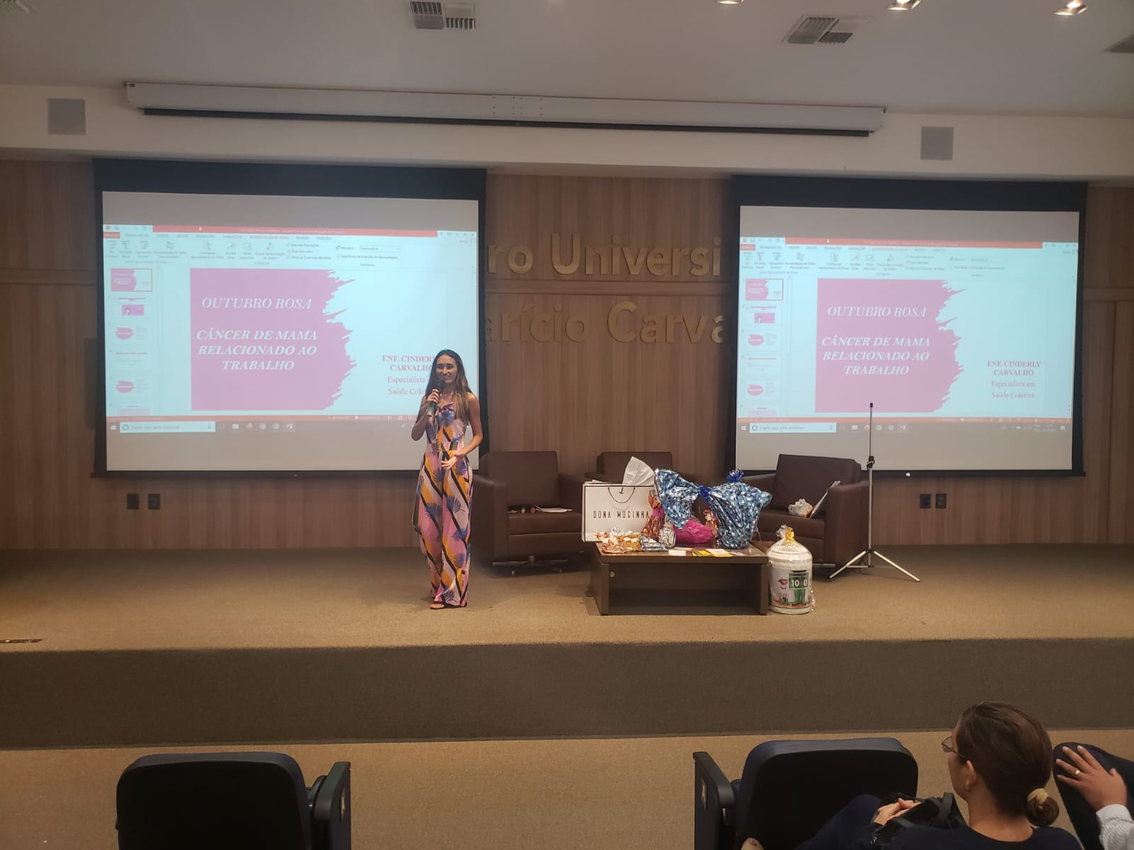A enfermeira egressa da FIMCA e especialista em Saúde Coletiva, Cinderly Carvalho, conversou com as funcionárias sobre o Câncer de Mama Relacionado ao Trabalho. A profissional trouxe informações sobre o que é o câncer de mama, fatores de risco, prevenção, o autoexame, sinais e sintomas.
