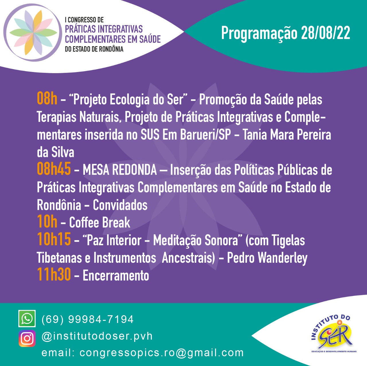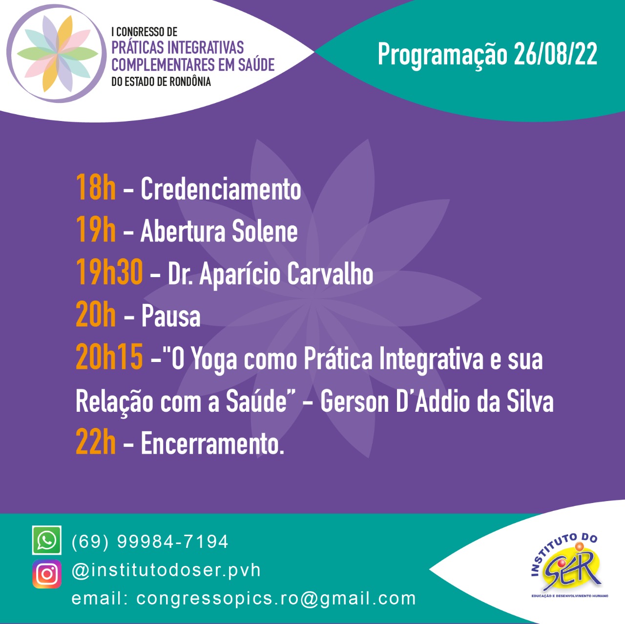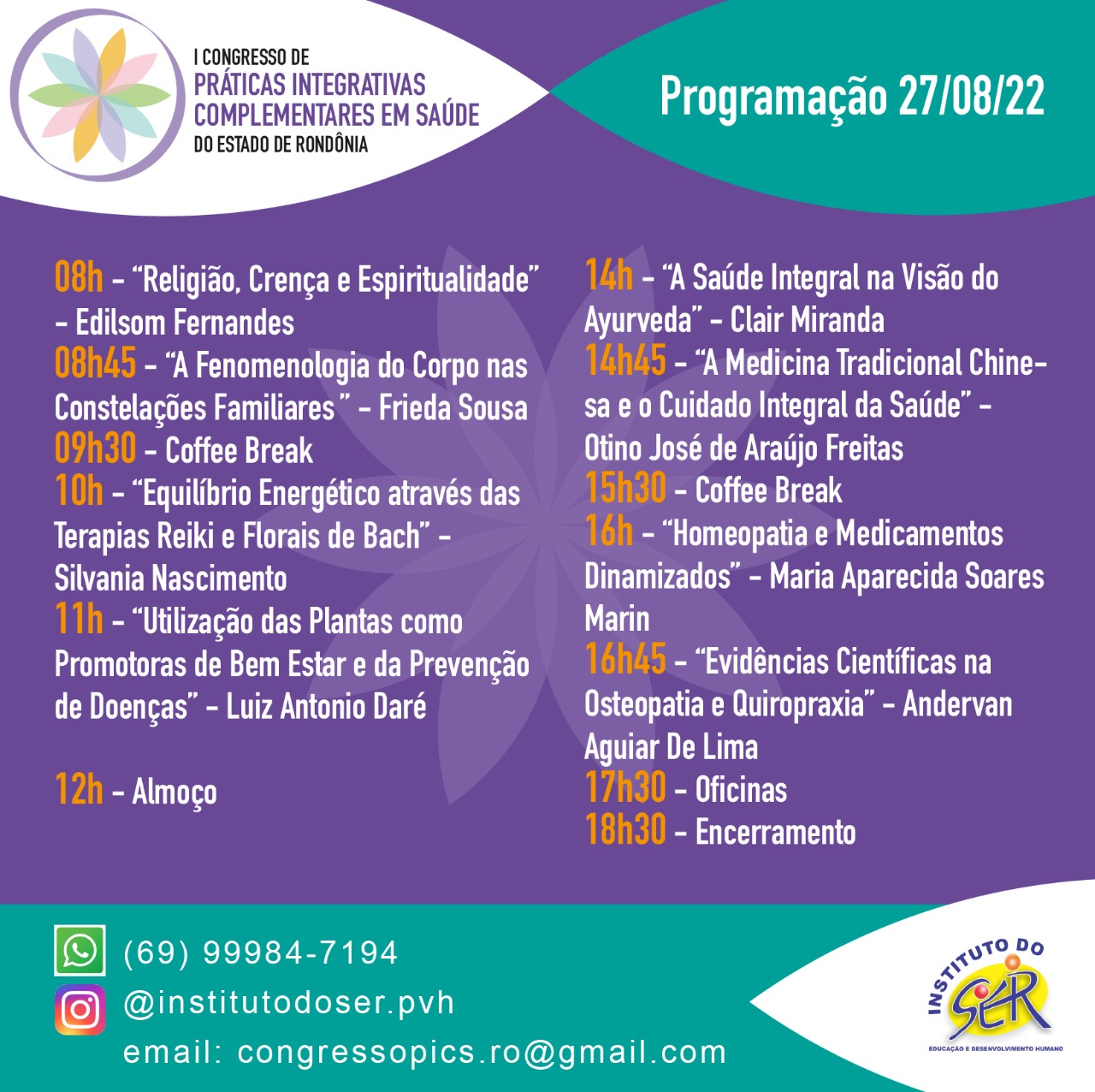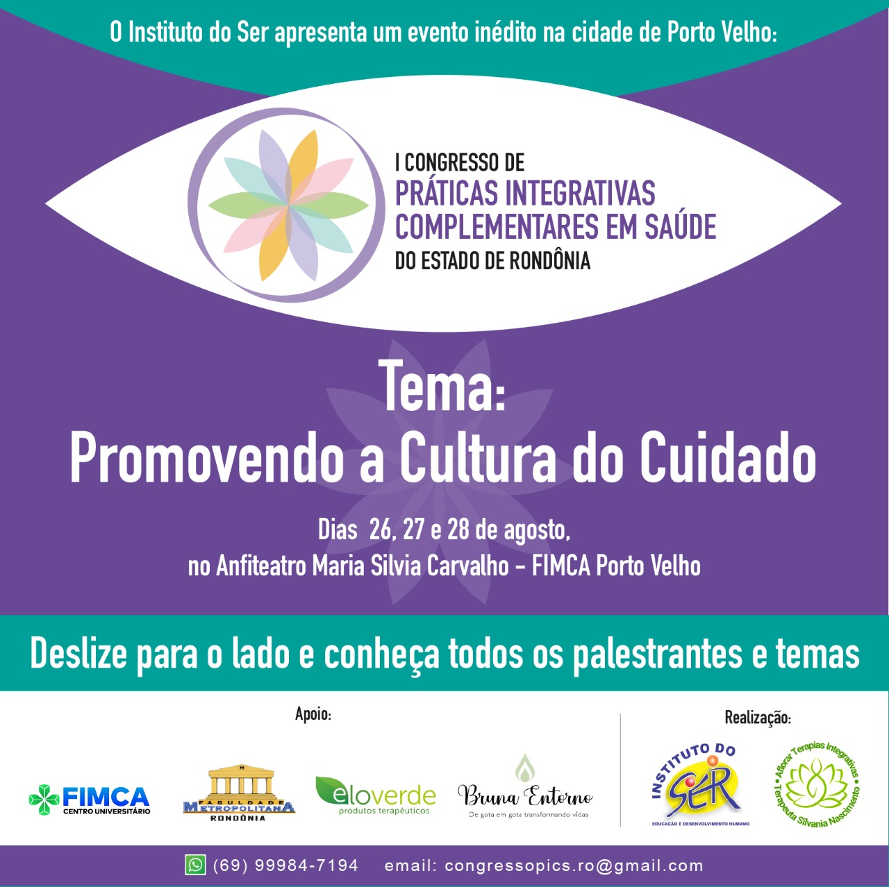 Nos dias 26, 27 e 28 de agosto a Centro Universitário Aparício Carvalho – FIMCA vai sediar o I Congresso de Práticas Integrativas Complementares em Saúde do estado de Rondônia, com o tema “Promovendo a Cultura de Cuidados”. As atividades vão acontecer no auditório Maria Silvia Carvalho.
