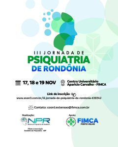O Centro Universitário Aparício Carvalho – FIMCA e a Faculdade Metropolitana de Rondônia realizam, nos dias 17, 18 e 19 de novembro de 2025, a III Jornada de Psiquiatria de Rondônia, um dos maiores eventos científicos da área da saúde mental na região Norte.