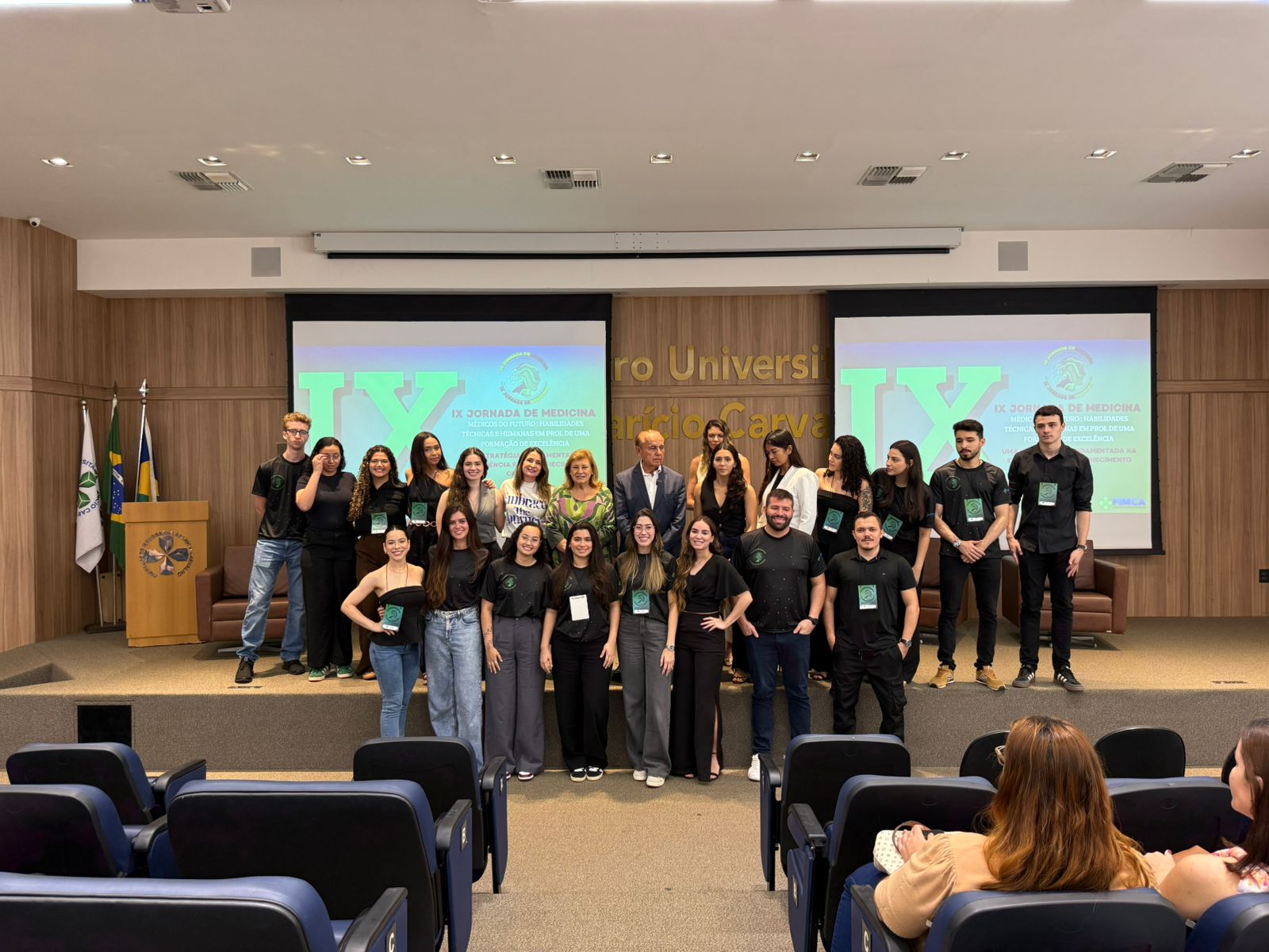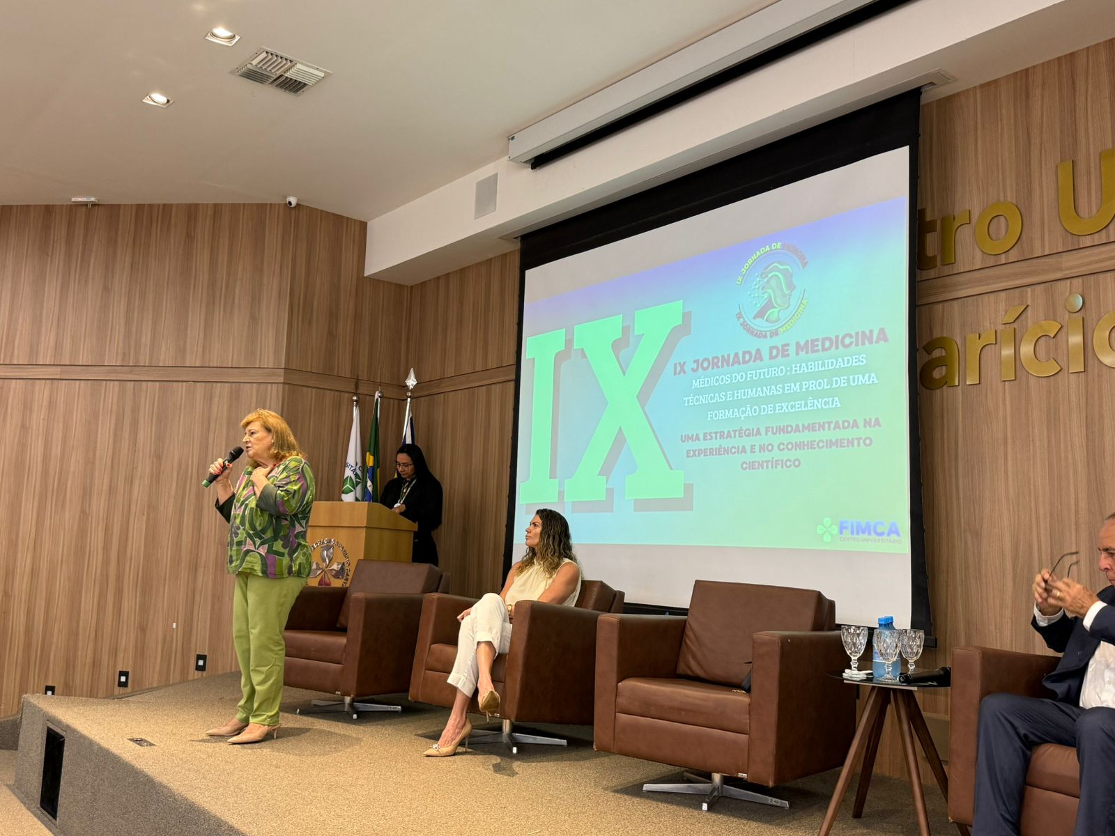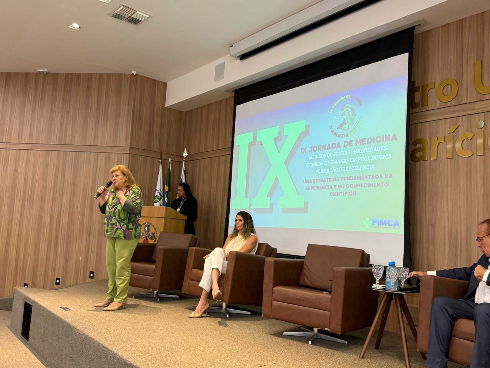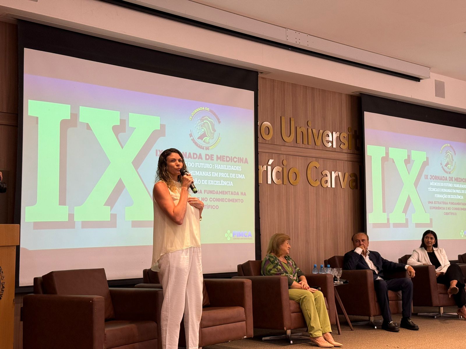 A cerimônia de abertura contou com a presença do Dr. Aparício Carvalho, reitor emérito e diretor presidente do Grupo Educacional Aparício Carvalho; da Dra. Maria Silvia Fonseca Ribeiro Carvalho de Moraes, reitora emérita; da Dra. Mariana Carvalho, reitora da FIMCA; da Dra. Vanessa Merlen, coordenadora do curso de Medicina, além da professora Mariana Delfino, vice-coordenadora, e da Dra. Alcione de Oliveira dos Santos, coordenadora docente da Jornada.