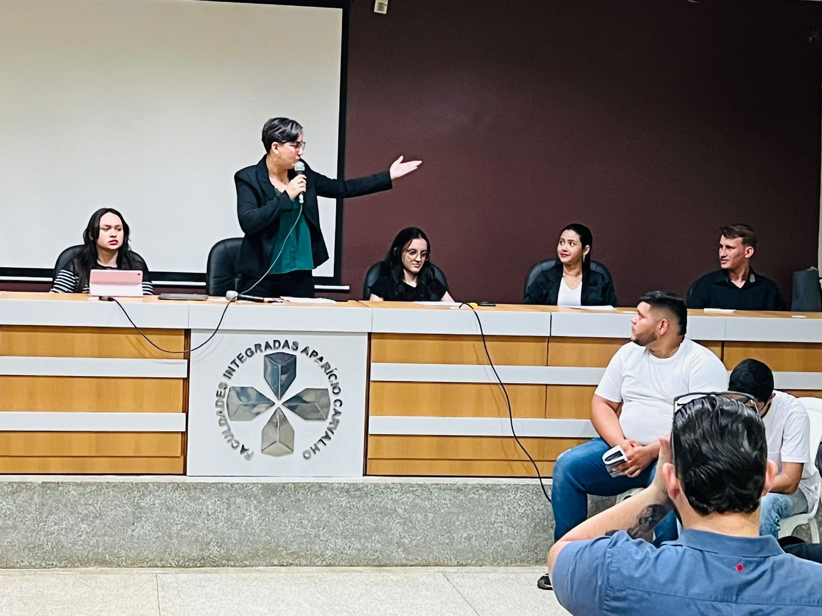 Elizama, ex-aluna e estagiária no CRF/RO, compartilhou sua trajetória e experiências profissionais com os acadêmicos. Sua participação trouxe uma perspectiva realista da vida profissional dos farmacêuticos, permitindo que os estudantes entendessem os desafios e aprendizados que podem surgir durante o estágio e na carreira.