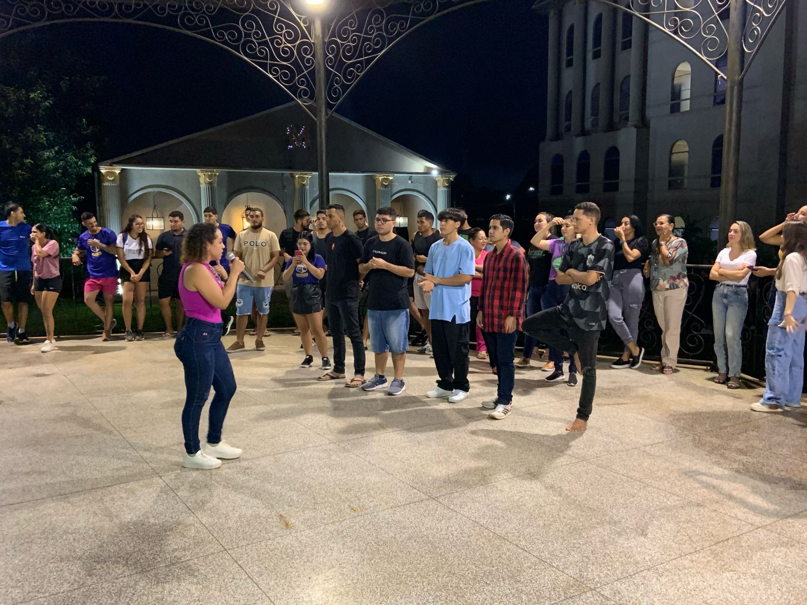 Já no coreto do campus, os cursos de Fisioterapia e Educação Física reuniram-se para um alongamento seguido de uma animada aula de fit dance para as acadêmicas, acadêmicos e colaboradoras presentes, encerrando a noite com sucesso e muita animação.
