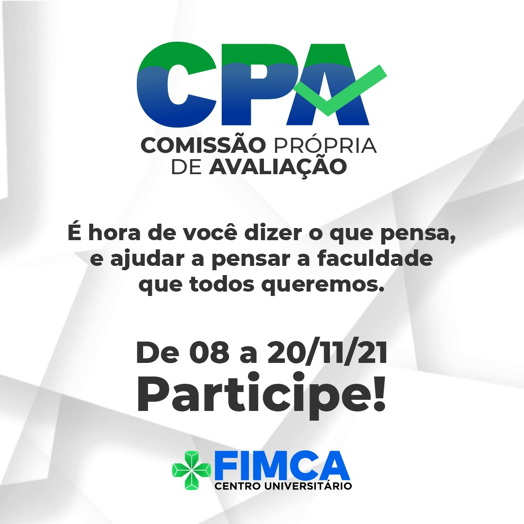 Como Instituição de Ensino Superior buscamos sempre oferecer o que há de melhor ao público que atendemos, acadêmicos, população e colaboradores, por esse motivo nós do Centro Universitário Aparício Carvalho – FIMCA de Rondônia temos o CPA – Comissão Própria de Avaliação, através desse canal buscamos a melhoria da nossa instituição. Participe e nos ajude a continuar proporcionando um atendimento de qualidade com eficiência e eficácia.