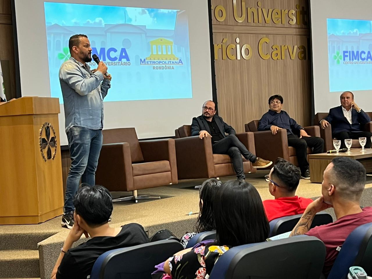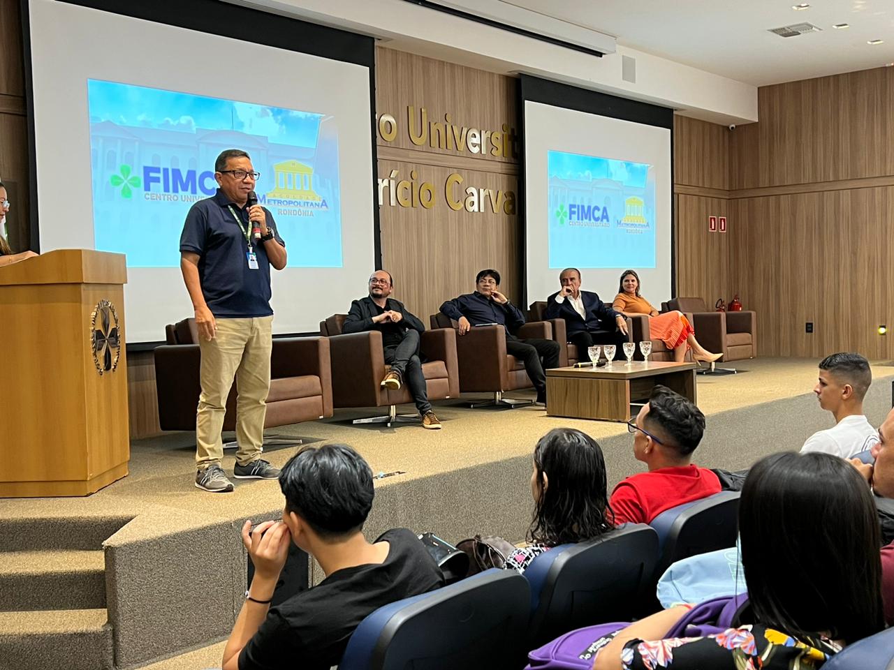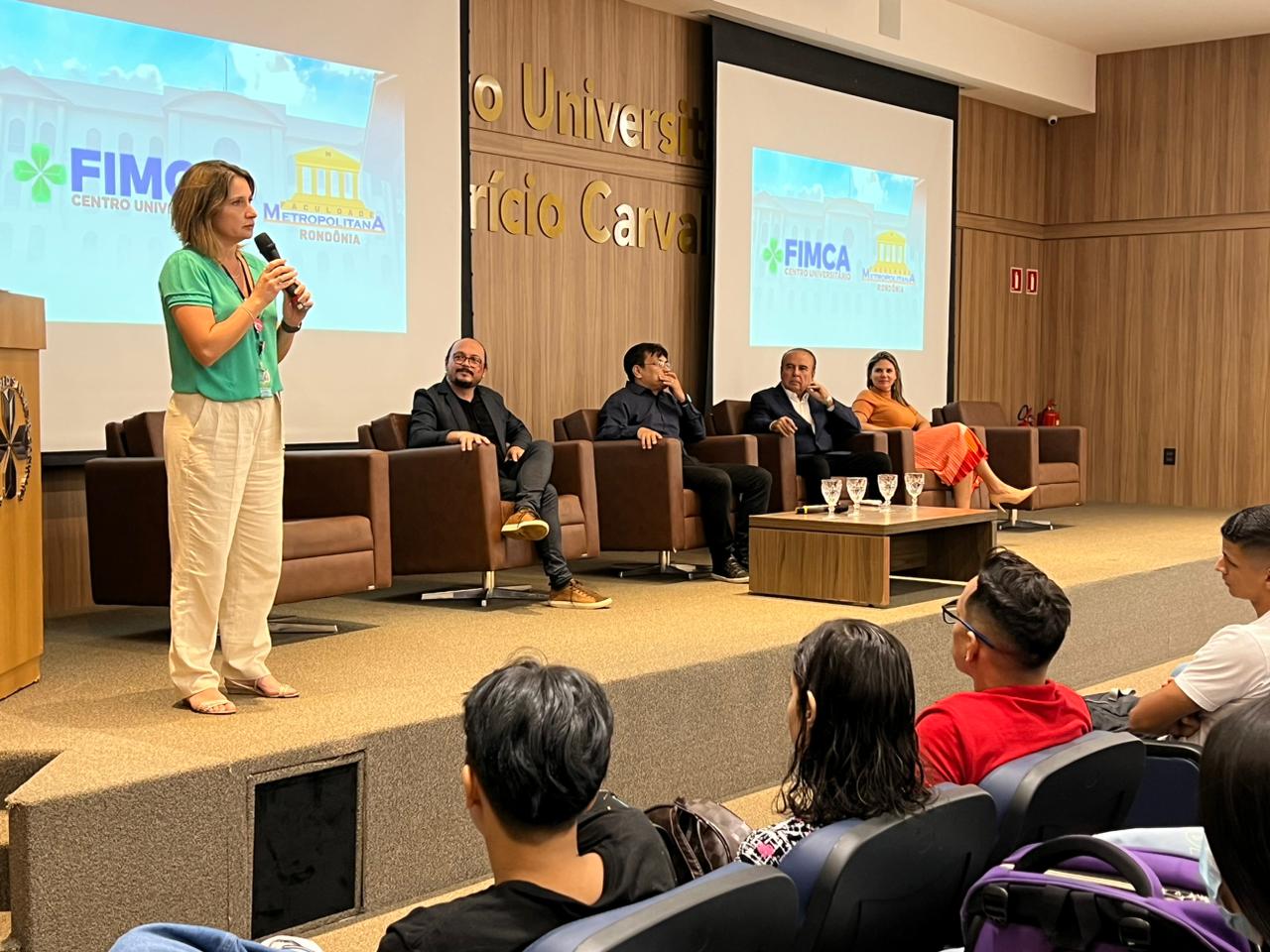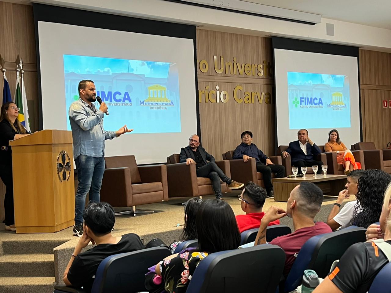 O Diretor Pedagógico Edimar Sartoro começou com a palavra, contando um pouco da história da FIMCA. Em seguida, falou o professor Luiz Ibanor, falando da qualidade dos nossos cursos e que temos os melhores professores, além da nota máxima conferida pelo MEC. A Diretora Acadêmica Dra. Nelice Batistelli expôs a importância da dedicação do acadêmico. Que de nada vai adiantar a melhor estrutura e os melhores docentes, se o aluno não fizer sua parte. A Dra. Maria Silvia relembrou o início da instituição, em 1998, e falou da emoção de ver o quanto cresceu. O Dr. Aparício Carvalho deu as boas-vindas aos calouros, ressaltando que terão a melhor estrutura, os melhores professores, e uma instituição empenhada em oferecer o melhor aos novos acadêmicos.