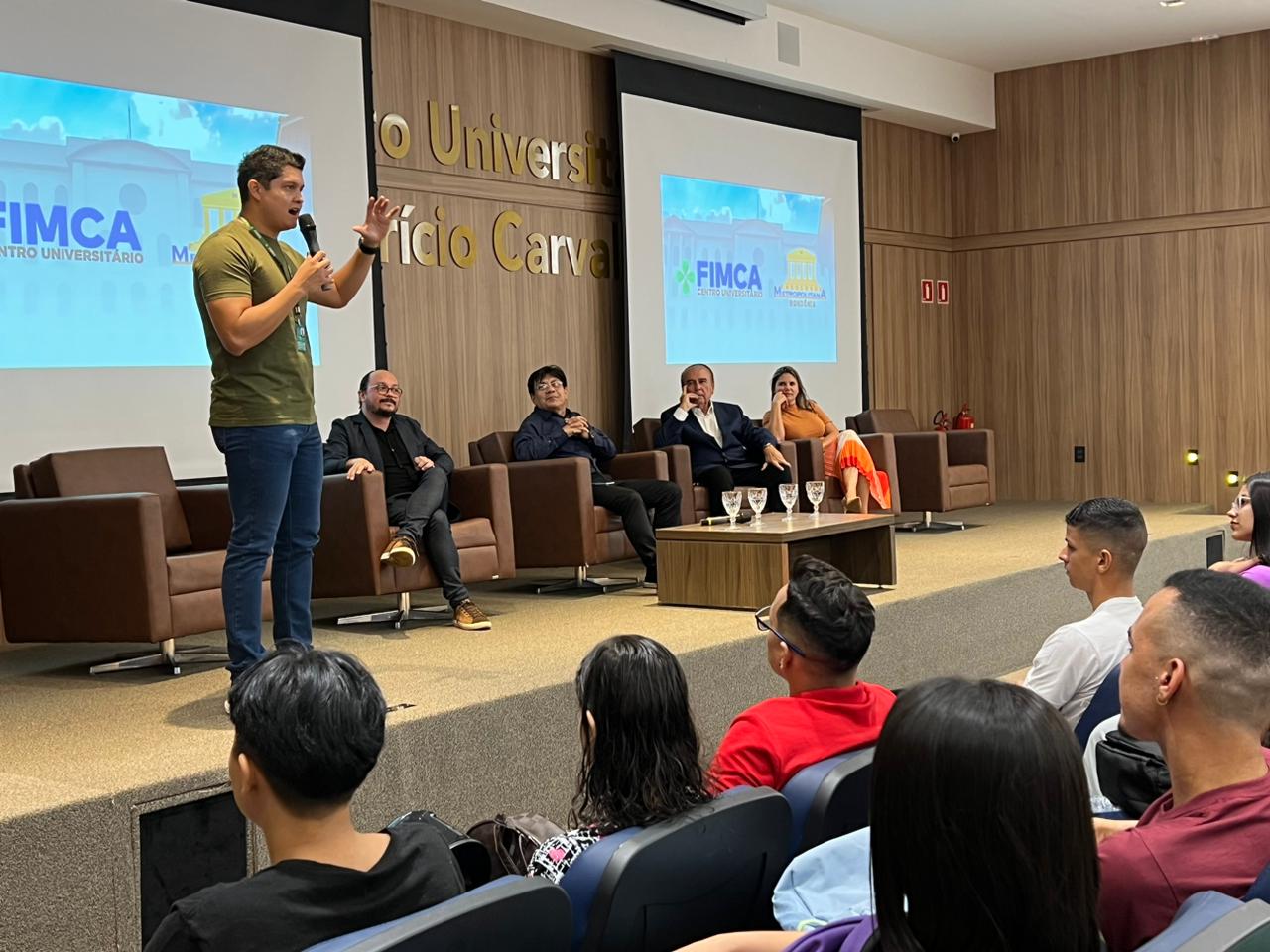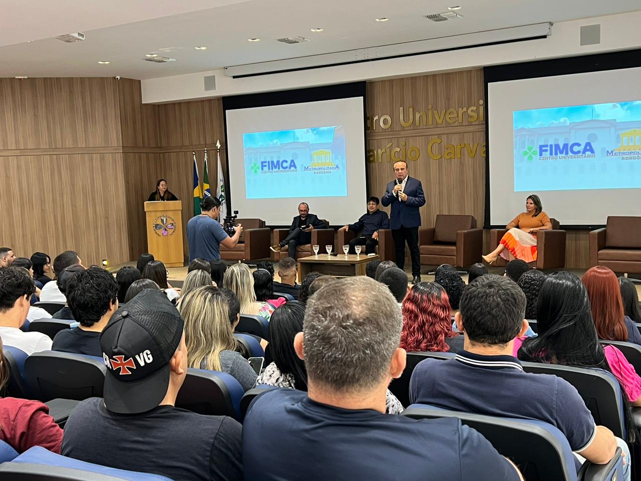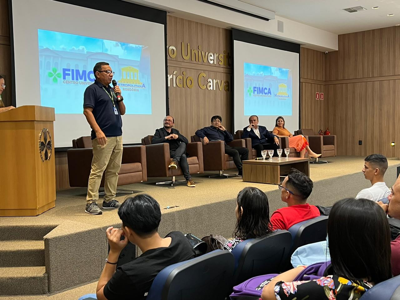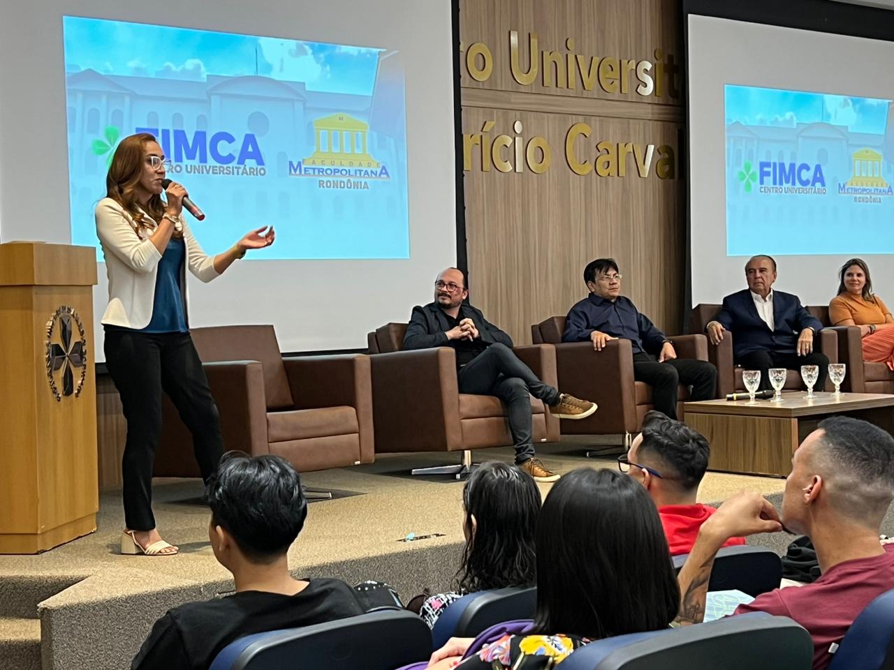 O Diretor Pedagógico Edimar Sartoro começou com a palavra, contando um pouco da história da FIMCA. Em seguida, falou o professor Luiz Ibanor, falando da qualidade dos nossos cursos e que temos os melhores professores, além da nota máxima conferida pelo MEC. A Diretora Acadêmica Dra. Nelice Batistelli expôs a importância da dedicação do acadêmico. Que de nada vai adiantar a melhor estrutura e os melhores docentes, se o aluno não fizer sua parte. A Dra. Maria Silvia relembrou o início da instituição, em 1998, e falou da emoção de ver o quanto cresceu. O Dr. Aparício Carvalho deu as boas-vindas aos calouros, ressaltando que terão a melhor estrutura, os melhores professores, e uma instituição empenhada em oferecer o melhor aos novos acadêmicos.